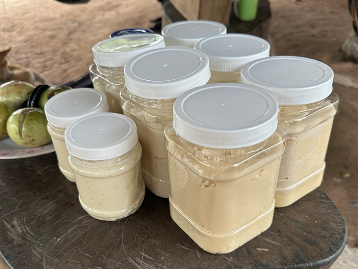 採取された樹液は1か所に集められ、ザルなどを使って不純物を取り除きます。